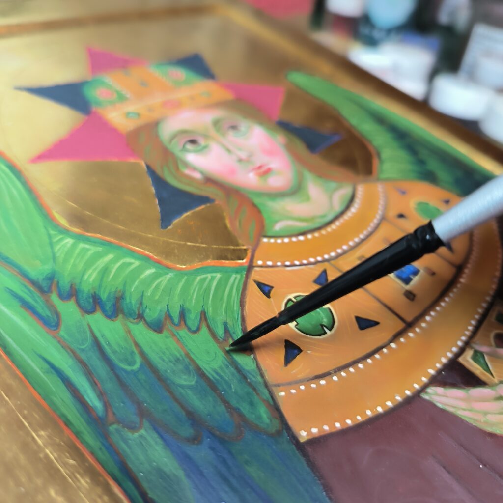 Na mojej ikonie (tej, którą właśnie piszę) jest też dużo zieleni, więc poszukałam informacji na temat symboliki tego koloru- oznacza stworzenie, barwa ta jest kojarzona z życiem, energią witalną i radością, ale też spokojem, równowagą, i- podobnie jak błękit-duchowością. Z drugiej strony- jak na obrazach Prerafaelitów- przemijanie, rozkład życia, a nawet zmysłowy popęd. Czasem też- młodość, niedojrzałość.
